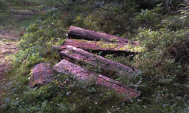 I skogen finns lämningar efter skogsarbete. Den här delen av skogen vårdas enligt gammal tradition. Ett träd i taget tas om hand vilket innebär att det är glest mellan träden och det finns inte något ris som annars så vanligt är.